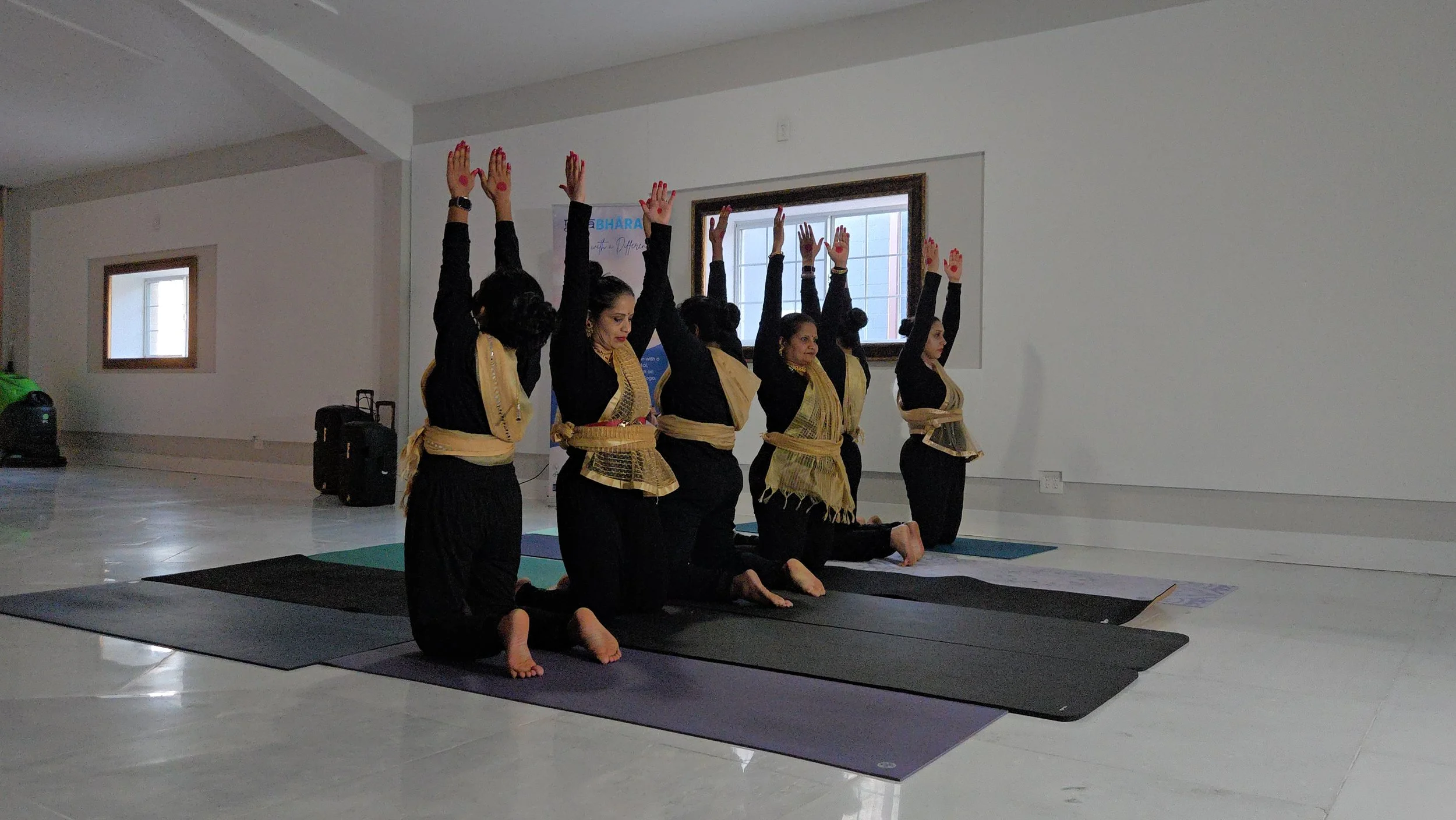 Advanced Yoga Session led by Savita with support from volunteer teachers Dinesh, Ved, and Sharat